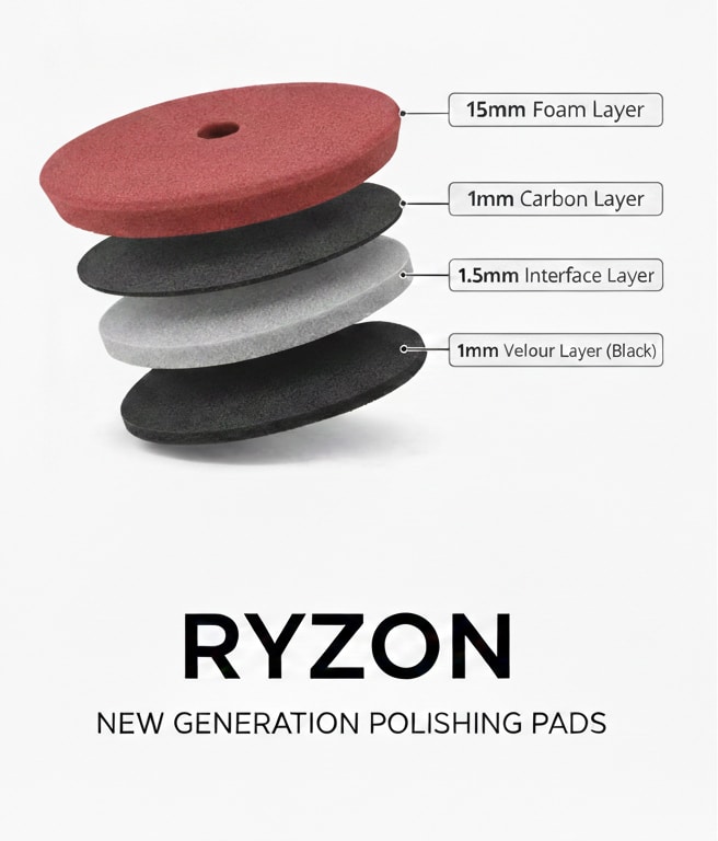Eine Neuentwicklung im Bereich der Polierpads! Die GESCHÜTZTEN RYZON Carbon Series sind absolute Highend Polierpads mit einer neuentwickelten Carbon-Interfaceschicht! Die speziell für uns zugeschnitte Zwischenschicht aus einem Hybriden Kohlefaser-Nylon Material bringt Polierpads auf das nächste Level.